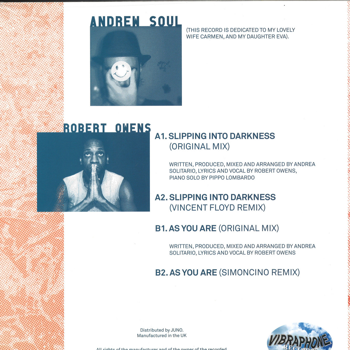 Vibraphone Records continues to deepen its contemporary repertoire by inviting Andrew Soul into the fold with a vocal contribution from house music legend Robert Owens. "Slipping Into Darkness" is a beautifully rendered deep house gem with expressive piano work, rubbery bass synth tones, but in some ways the minimalism of Vincent Floyd's remix gives Owens' vocals a chance to take centre stage. "As You Are" is a crooked, broken beat exploration on the fringes of deep house, and Owens' voice sounds resplendent in the more experimental surroundings before Nick Anthony Simoncino comes on board with a 90s flavoured, darkside remix of the highest order.