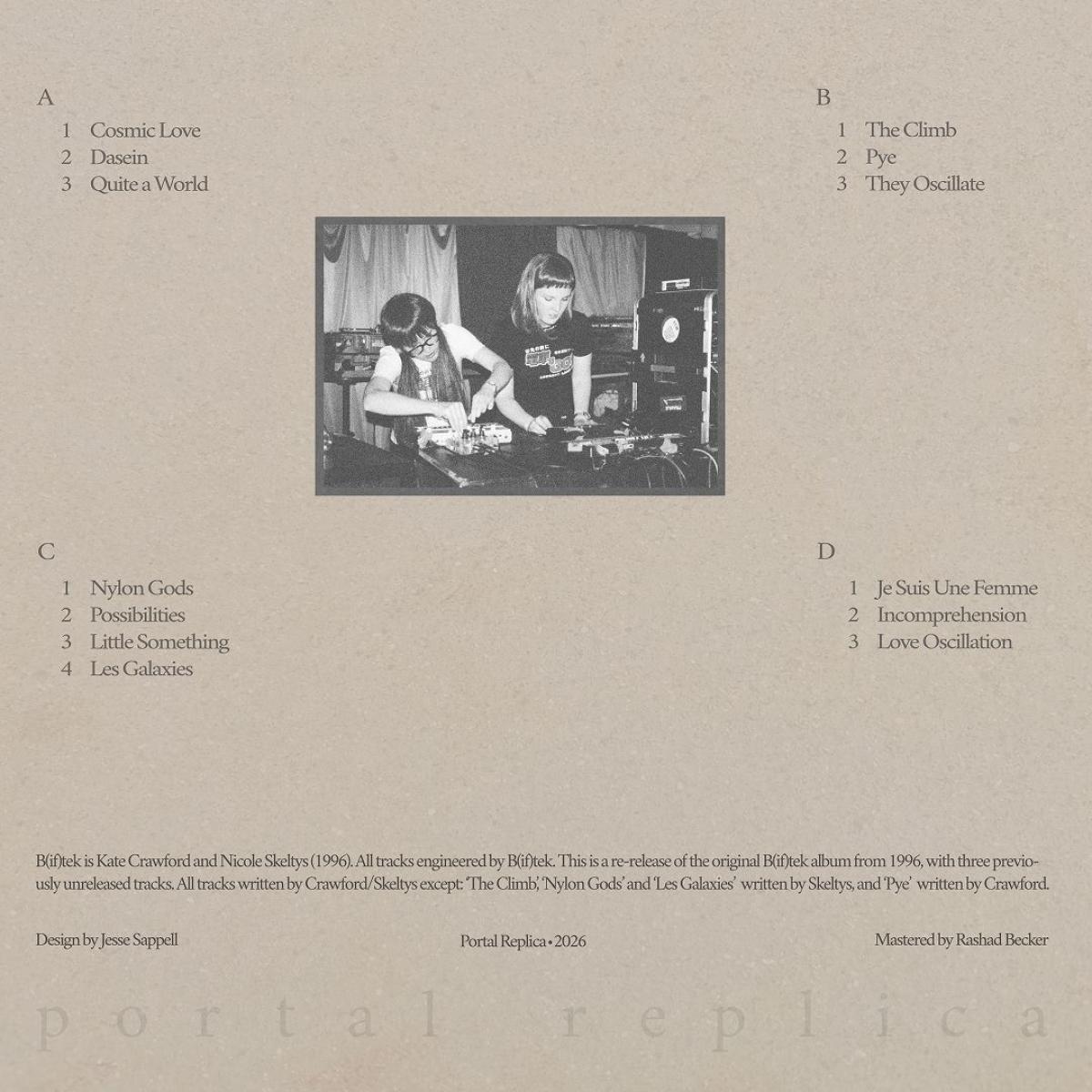 Kate Crawford and Nicole Skelty’s pioneering electro-femme outfit ‘B(if)tek’ can be traced back to 1994 in Canberra, where lack of blueprint blossomed their playful and bizarre experimentations in techno — ‘feminism with a wink and a bleep’. Thirty years on, the uniqueness and ingenuity of B(if)tek’s deep analogue exploration endures.