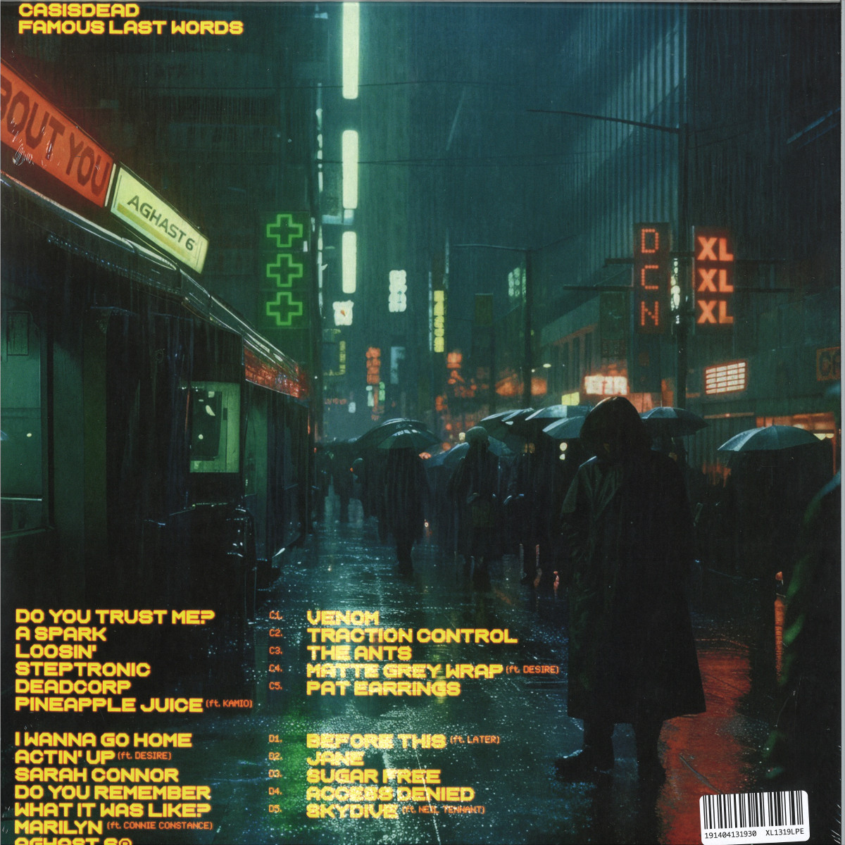 Famous Last Words is a fully realised expansion of the dystopian futurism that has captivated audiences since CASISDEAD first announced himself in 2013. Over the past decade, he"s dipped in and out of the shadows, blessing fans with cult hits while maintaining his anonymity, shunning media attention and donning various masks; a rejection of the spotlight that"s helped to create folklore around a rapper who"s widely regarded as one of the UK"s most inventive lyricists. Famous Last Words is as much a sci-fi film as it is a rap record, a labyrinth of vice, crime and faded glamour. The listener steps through a portal into a realm narrated by CASISDEAD, whose command of storytelling drops you right into the underground of a city where he is the main character in a shady network of gangsters, girls and drug deals. However, Famous Last Words isn"t a story of bravado or posturing; much of the album deals in themes of loss, regret and paranoia, a persona constantly self-reflecting amongst the madness that surrounds him. The album features a carefully and idiosyncratically curated roll call of collaborators including Pet Shop Boys" Neil Tennant, Connie Constance, Kamio and Desire. The vocalists are immersed in CASISDEAD"s hallmark 80"s-inspired synthpop soundscapes, aided and abetted by a production cast that includes Stranger Things composer Kyle Dixon and producer, composer and Italians Do It Better label founder Johnny Jewel. Meanwhile, actors Ed Skrein and Emma Rigby"s narrative weaves through the record, amplifying the widescreen, cinematic experience.