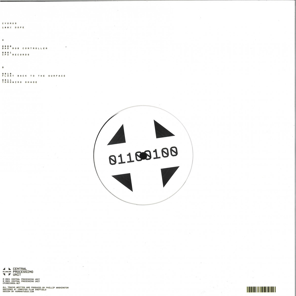 With '100% Dope' we find Central Processing Unit bringing up their hundredth catalogue number, and you'd struggle to find a more fitting artist to ring in a century of releases for the label than Cygnus. The one born Phillip Washington has been with CPU since the very beginning, his 2012 LP 'Newmark Phase' representing the first record ever released on the imprint. That album's combination of textured techno and grizzly Drexciyan electro set the tone for CPU perfectly, and it's no surprise that Cygnus has returned to the Sheffield imprint several times down the years.