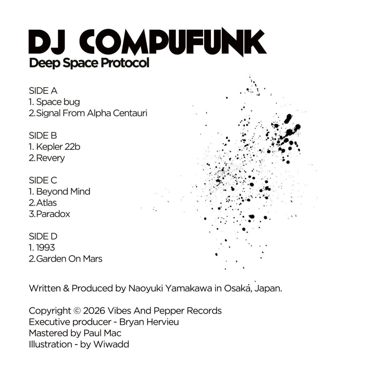 4From the subterranean grooves of deep techno to the cosmic pulse of electro and IDM, Deep Space Protocol sees Japanese legend DJ Compufunk navigate a vast sonic universe with precision and feeling. A veteran of Osaka’s celebrated Compufunk Records scene — where he’s sold and spun cuts for nearly three decades — Compufunk seamlessly weaves together influences that span Detroit-infused machine rhythms, hypnotic electro textures, and the thoughtful intricacies of left-field IDM.