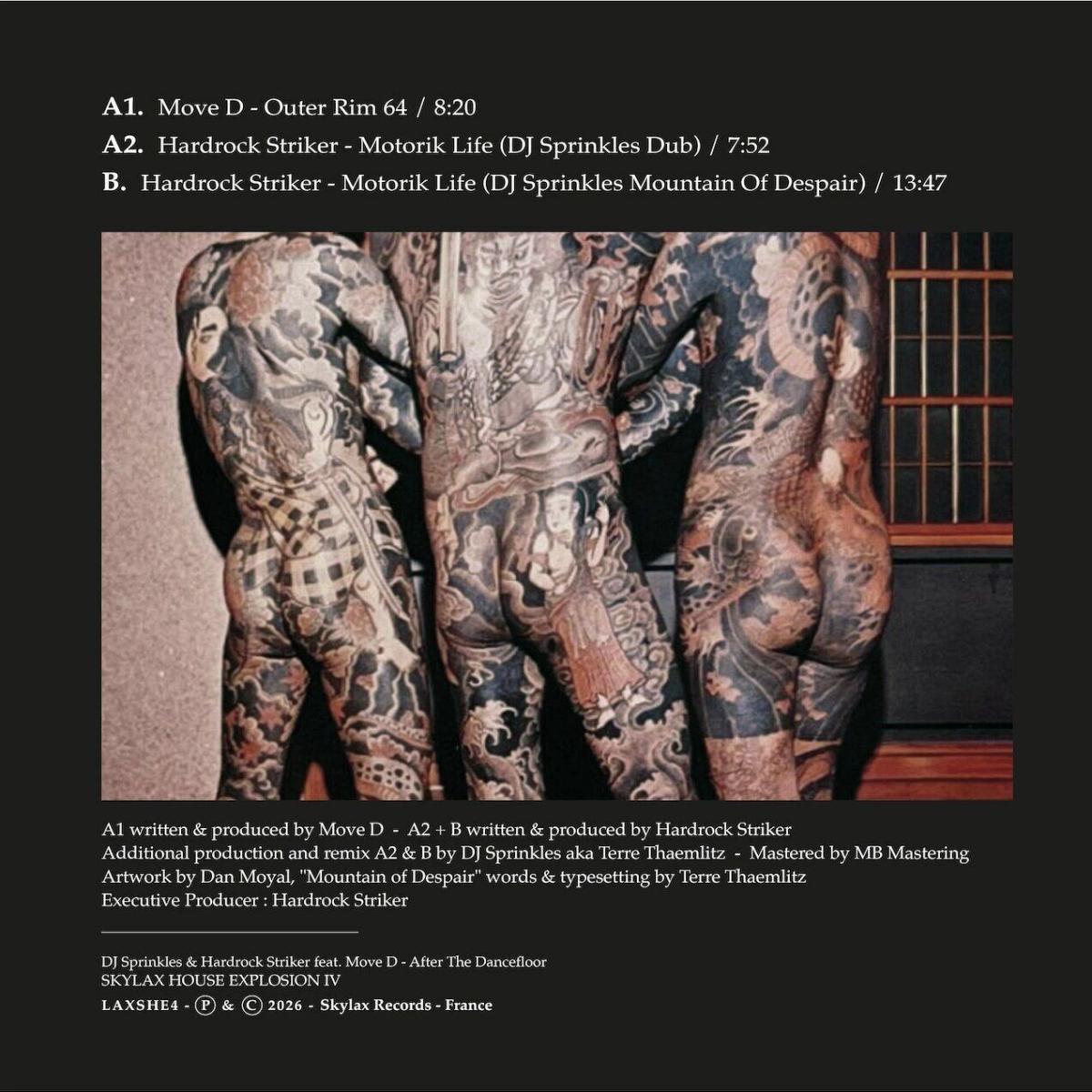 89A defining transmission in the history of Skylax Records. Originally released across different moments of the Skylax catalogue, these recordings are now assembled as the final chapter of the Skylax House Explosion series — a project exploring the architecture, memory and survival mechanisms embedded within house music culture. The record opens with Move D’s “Outer Rim 64”, originally released in 2018 as part of the Skylax House Explosion narrative. Suspended between motion and distance, the track establishes the conceptual perimeter of this final chapter — a space where rhythm no longer functions only as propulsion, but as orientation. Here the listener stands at the outer edge of the dancefloor’s architecture, where structure persists even as its original social conditions begin to disappear. The sequence continues with Hardrock Striker’s “Motorik Life (DJ Sprinkles Dub)”, originally released in 2011. Rather than operating as a conventional remix, the Dub reinforces the motorik continuum of the original composition, transforming repetition into endurance. DJ Sprinkles preserves the infrastructural skeleton of the dancefloor — its capacity to sustain bodies through duration alone, without narrative resolution or emotional release. The record culminates with “Motorik Life (DJ Sprinkles Mountain Of Despair Remix)”, one of the most politically explicit works ever associated with Skylax Records. Through the relentless repetition of the phrase “mountain of despair,” Terre Thaemlitz dismantles the traditional function of dance music, transforming remix culture into structural critique. Referencing Martin Luther King Jr.’s famous metaphor, the remix removes the promise of redemption and leaves only the architecture of struggle. The dancefloor is no longer presented as escape, but as a temporary condition of survival. Together these recordings reveal house music’s true function: not to resolve despair, but to create temporary conditions in which bodies can continue to exist despite it.