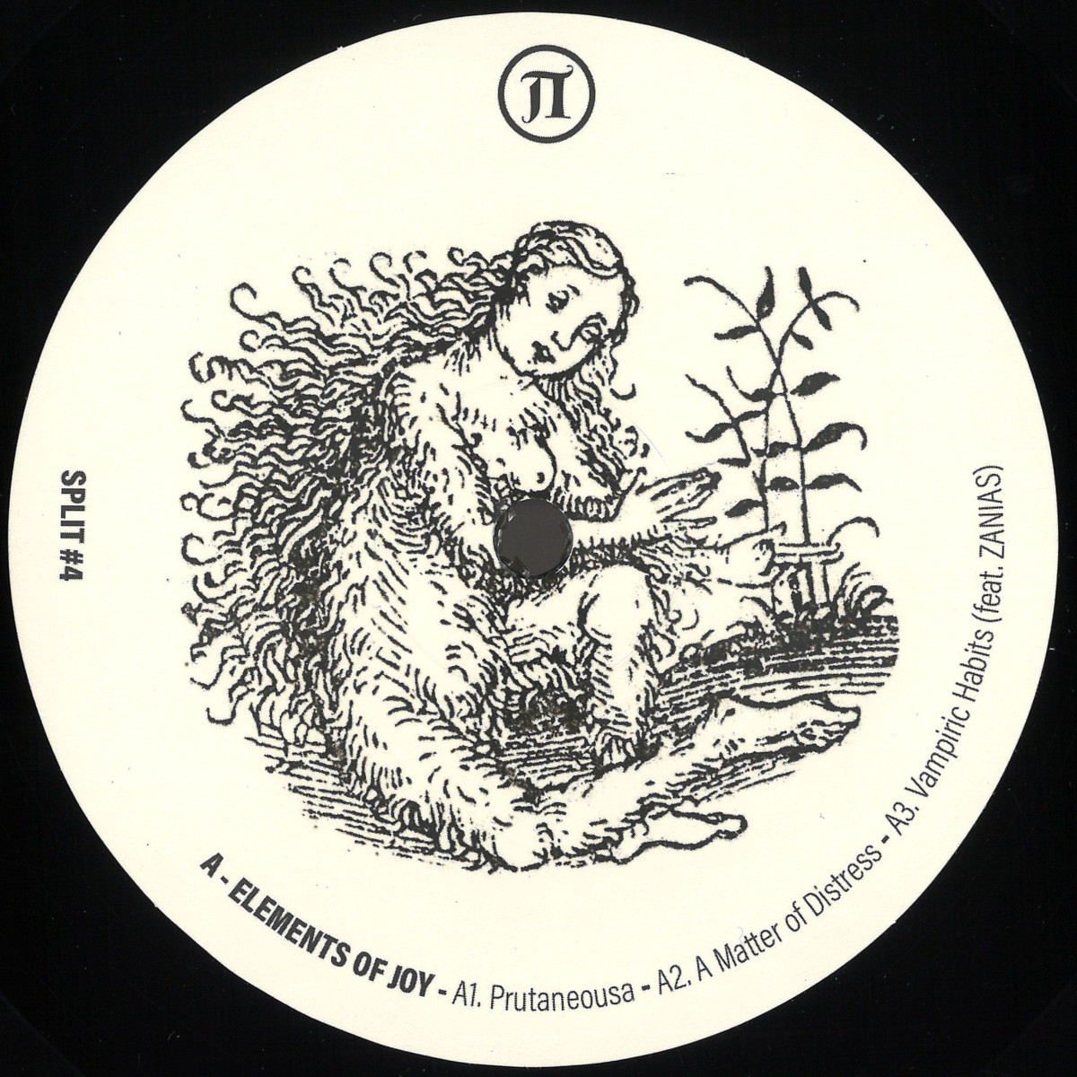 On the A-side Elements of Joy delivers 3 original tracks of New-Beat leaning techno including one song that features vocals by Zanias. The opening track "Prutaneousa (A1)" connects the dots between his previous entry on the label and this one with the use of retro 80s inspired vocal samples but this time on a rather driving beat sequence than an industrial/noise one. "A Master of Distress (A2)" dives deeper into a hypnotic mood while "Vampiric Habits (A3)" takes it even further to an ethereal atmosphere through the input of Australian vocalist Zanias.