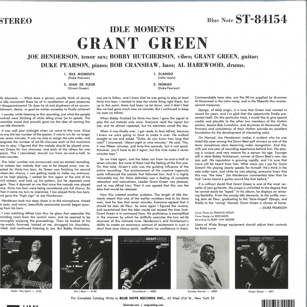 Time and troubles seem to melt away during the fifteen enrapturing minutes of “Idle Moments,” the opening track of Grant Green’s sublime 1963 album of the same name. As the piece unhurriedly unfurls all the unique colours of the ensemble present themselves with Green’s soulful guitar joined by Duke Pearson’s elegant piano, Bobby Hutcherson’s crystalline vibraphone, Bob Cranshaw’s reassuring upright bass, Al Harewood’s subtle drums, and Joe Henderson’s magnificent tenor saxophone. The pace quickens for the rest of this tremendous set including the nimble Green original “Jean de Fleur,” a bluesy take on John Lewis’ MJQ standard “Django,” and a driving performance of Pearson’s original “Nomad.” This Blue Note Classic Vinyl Edition is all-analog, mastered by Kevin Gray from the original master tapes, and pressed on 180g vinyl at Optimal.