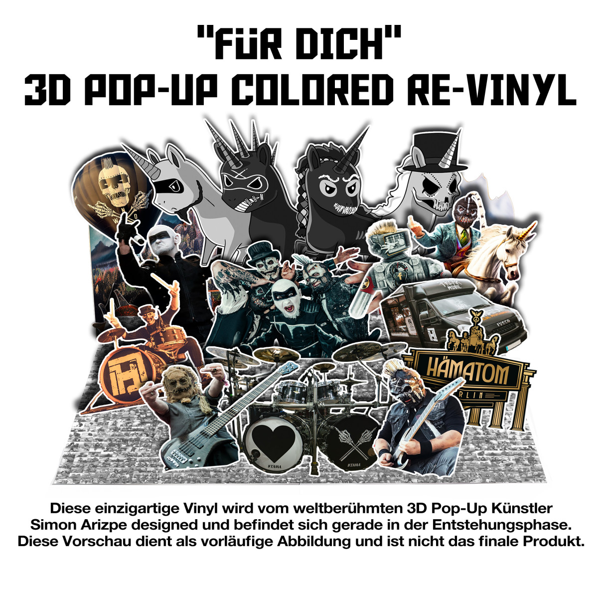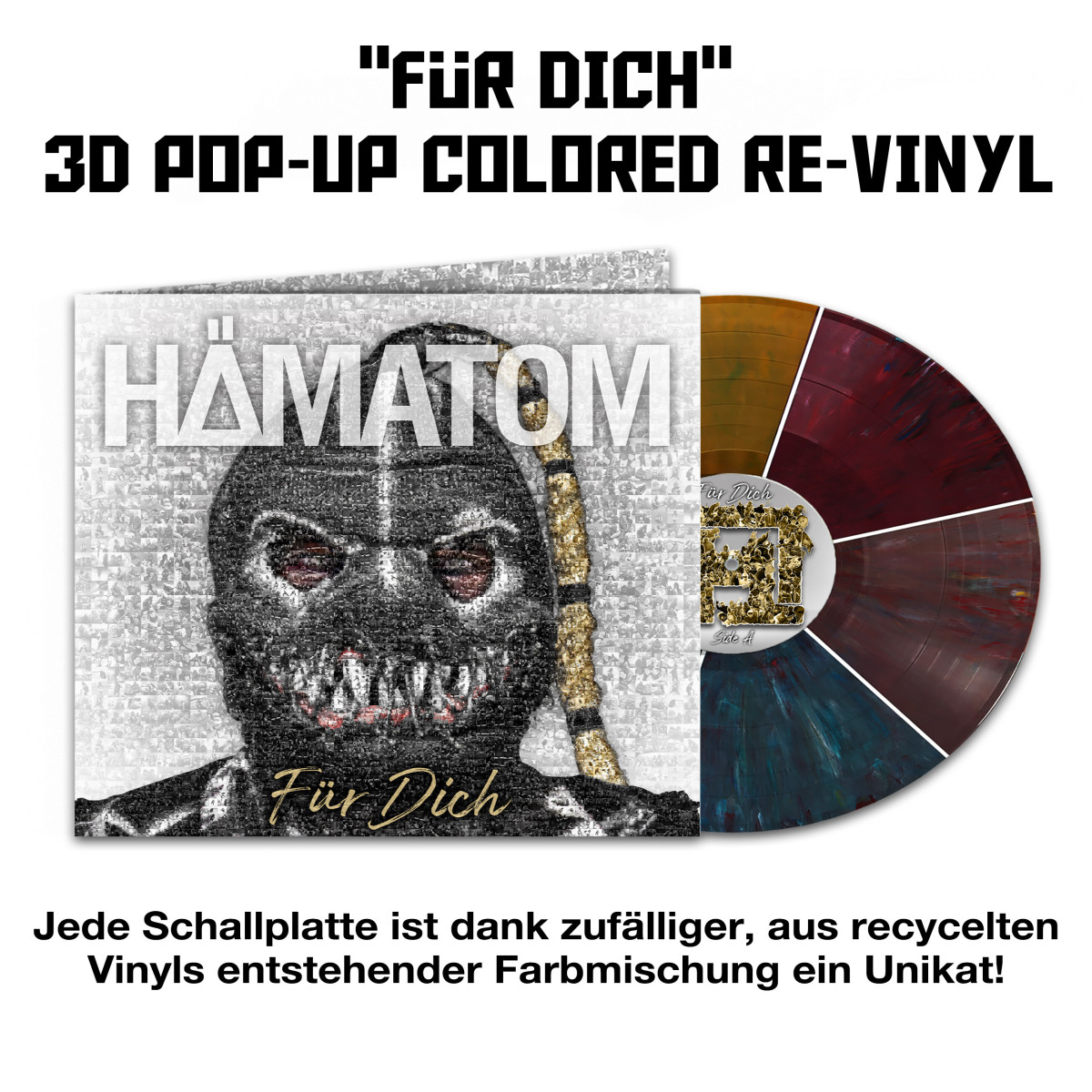 Um der Besonderheit ihres neuen Albums Ausdruck zu verleihen und die Vinyl-Edition von "FÜR DICH" einzigartig zu machen, holten HÄMATOM den weltbekannten PopUp-Künstler Simon Arizpe ins Boot. Gemeinsam mit dem NewYorker entsteht in den kommenden Monaten ein noch nie dagewesenes Schallplatten-Kunstwerk, das den Betrachter beim Aufklappen der Vinyl in eine, aus visuellen Erinnerungen der letzten 20 Jahren kreierte HÄMATOM Welt, mitnimmt. Auch das musikalische Herzstück ist eine absolute Besonderheit, da jede Schallplatte durch die Verwendung von recycelten Vinyls zu einem farblichen Unikat wird.