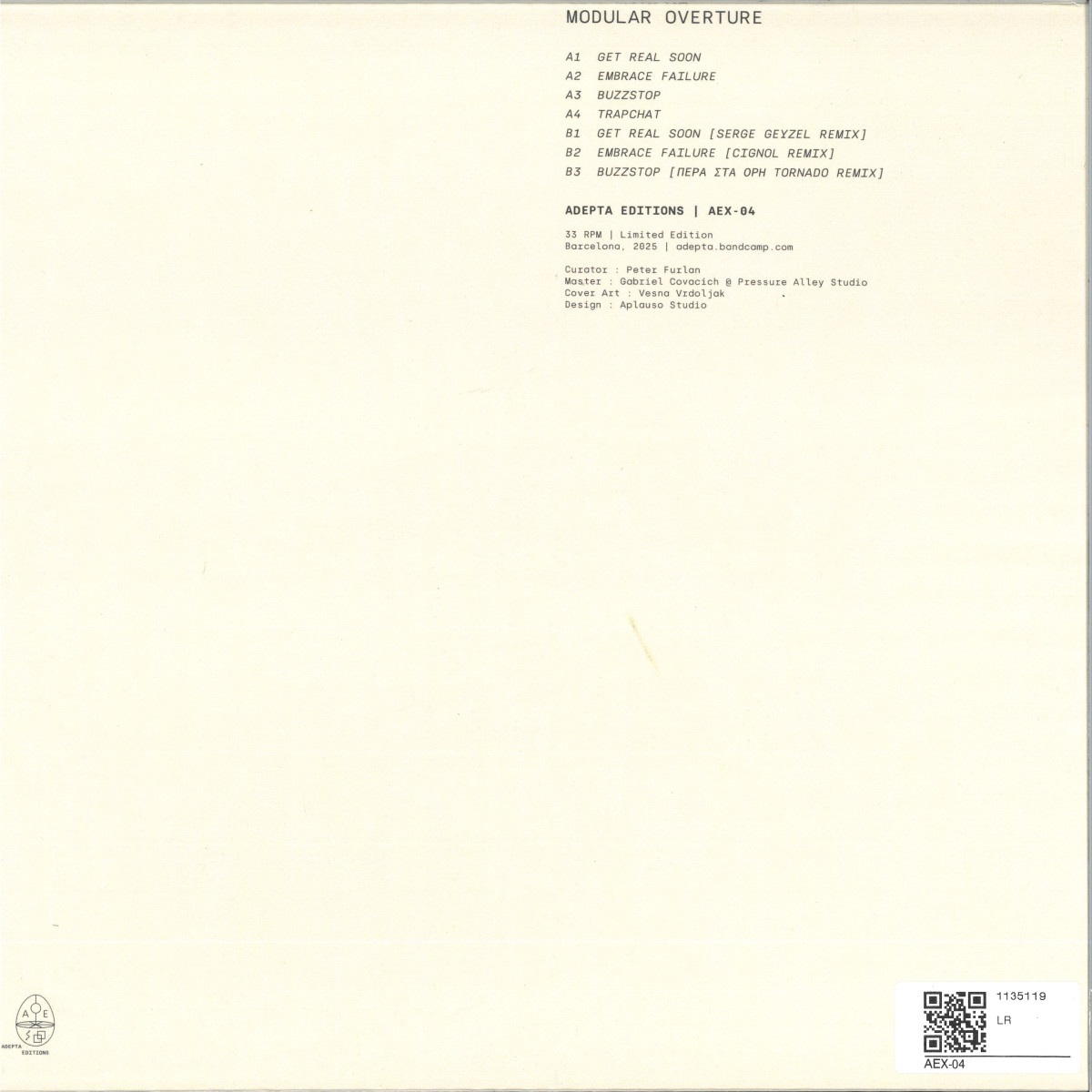 6Jon Murphy marks the 4th release on the Barcelona-based label Adepta Editions with ''Modular Overture'', a 12" vinyl EP that explores the depths and textures of modular sound. Modular Overture is a meticulously crafted work built with a Eurorack system, where Murphy creates immersive atmospheres, delving into the experimental realm of raw, analogue synthesis, unafraid to explore abrasive sonic territories. In addition, the EP features three remixes by prominent artists in the electronic scene: Serge Geyzel, Cignol, and PERA STA ORI, who bring their own perspectives and styles to Murphy's work, further enriching the sonic experience. Comes with printed sleeve and is a strictly limited pressing of 200 copies!