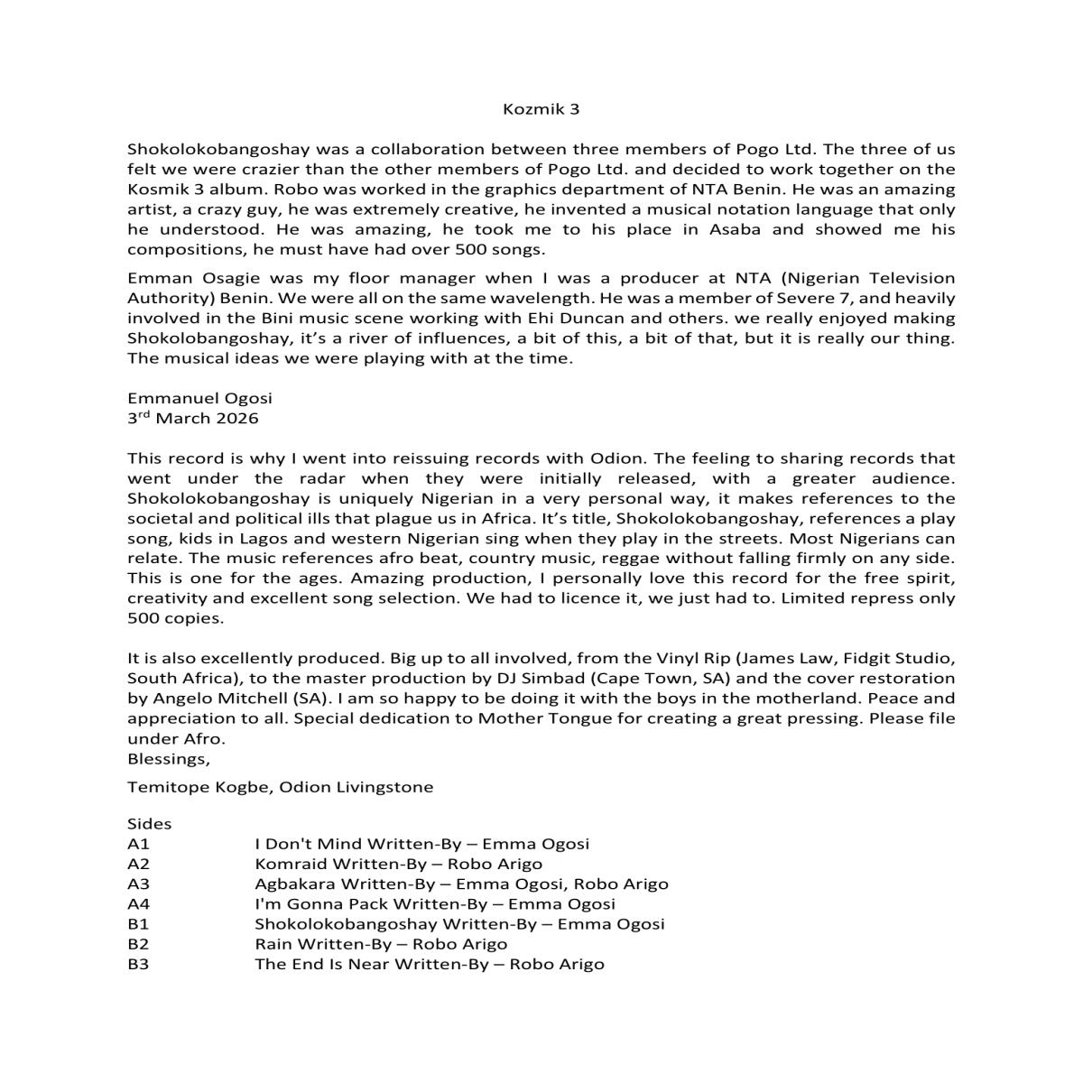 Kosmik 3, Shokolokobangoshay LP ODILIV013, 2026-04-28 00:00:00, .