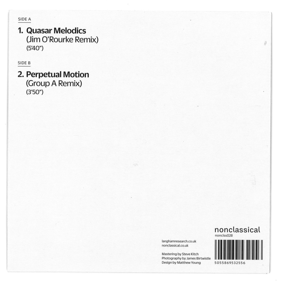 On Side A, Jim O'Rourke uses 'Quasar Melodics' as his source material, transforming fizzing grains of sound into an oceanic swirl of noise. On the flip, group A find metallic rhythms and eerie melancholy in 'Perpetual Motion'.