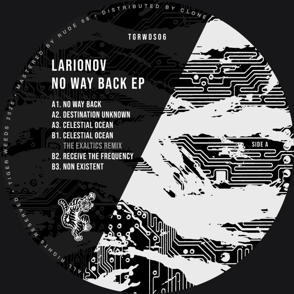 Larionov lands on Tiger Weeds with 'No Way Back'. A direct, tension driven electro EP shaped by raw sequences, melancholic tones and steady forward motion. Throughout the release, Larionov balances stripped-back introspection with functional dancefloor energy. On remix duties, The Exaltics drags 'Celestial Ocean' into darker territory, applying his signature cinematic pressure to create a heavy, peak time version. No gimmicks. No fillers. No way back.