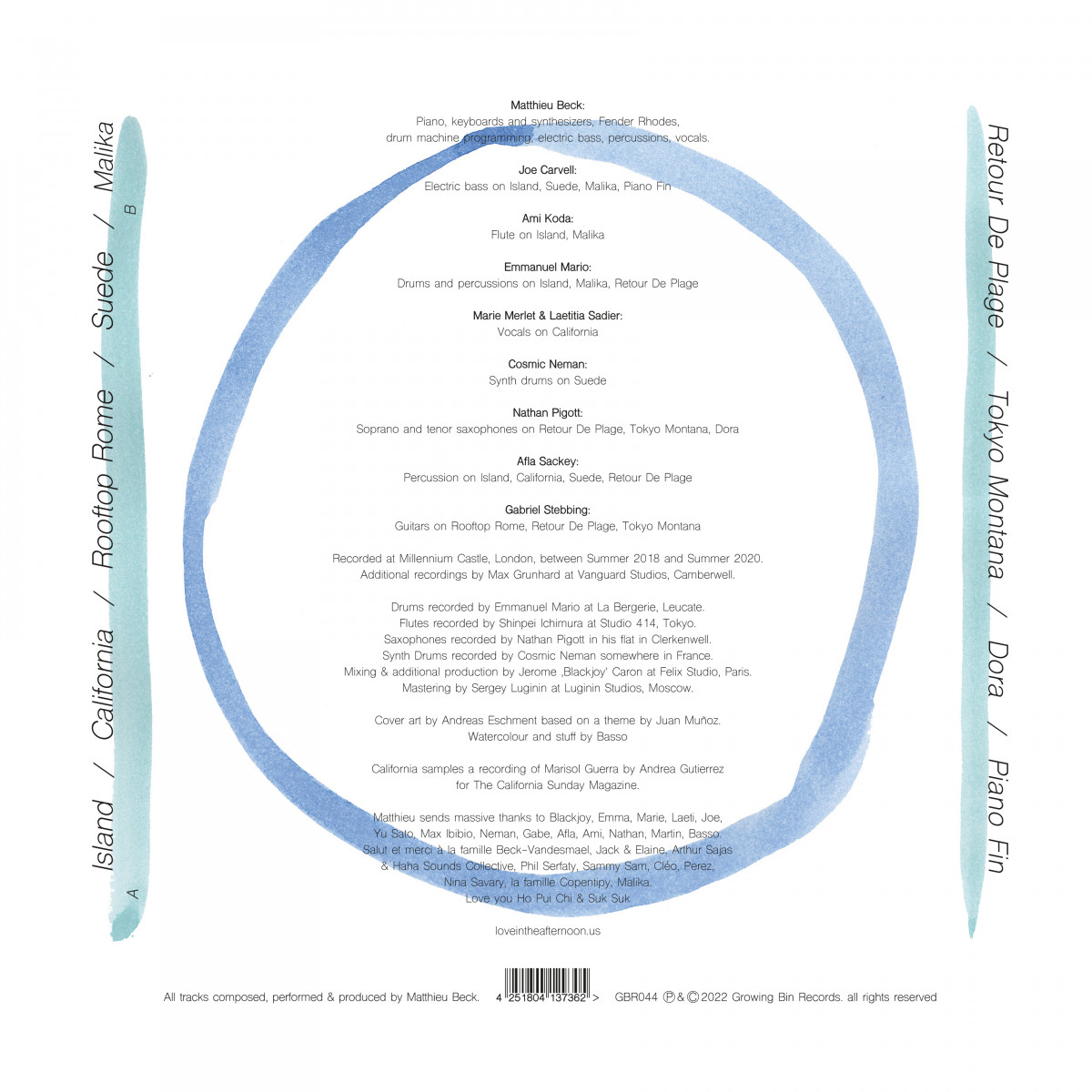 Though the tracklist may read like a travelogue, these nine tracks all began at home with Matthieu sat behind a Fender Rhodes with a drum machine by his side. Soon live bass, saxophone and flute strolled into his unhurried arrangements, retaining the simplicity of his demos while expanding the emotion. Weighty synth drones and bubbling bass balance the airy elements of tracks like "California" or the dream-pop romance of "Rooftop Rome", while the mellow "Malika" and joyful "Retour De Plage" showcase the Frenchman's relationship with jazz. Elsewhere there's hints of digi-dub ("Island" and "Suede"), coastal boogie ("Tokyo Montana"), stripped back city pop ("California") and downtown nostalgia ("Dora"), before Beck arrives at the poetic, progressive but peaceful finale "Piano Fin", which recalls Air at their prettiest, without stepping outside Matthieu's well defined sound.