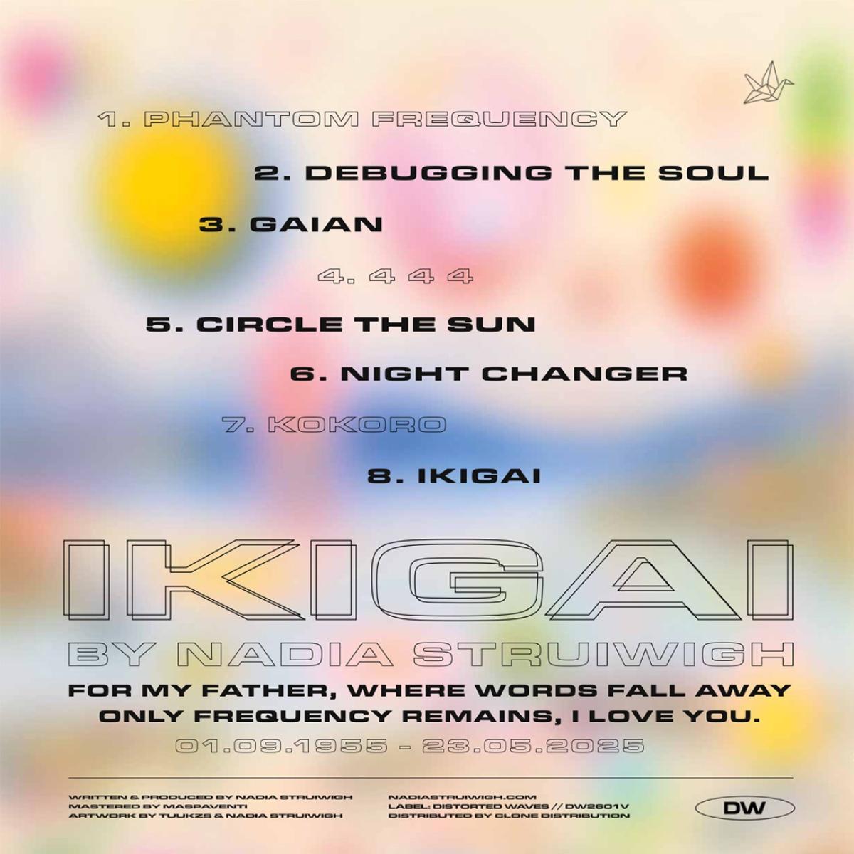 1Selection of IKIGAI Album by Nadia Struiwigh. IKIGAI was born in the quiet space between grief and remembering... Made entirely on hardware, from my living room in Berlin near Hermannplatz (my dad's name is Herman -- the odds), in the months my father passed away. Every sound, every sequence, every texture carries his fingerprint. Not because he made music, but because he made me love gadgets. Circuits, signals, blinking lights. He was the man who opened me up to machines and taught me how, eventually, to listen to them and use them for my craft. The name IKIGAI, a Japanese word for ''reason for being,'' found me when I was at a crossroads. The kind where you ask yourself: Why am I still here? What am I still creating for? What part of me still believes in beauty when everything feels like it's falling apart? These pieces came through slowly, on Japanese gear like Yamaha SEQTRAK, KORG, Roland -- like threads weaving a tapestry I didn't know I was making. Each track is a kind of purge... to him, to myself, to the listeners who find themselves in the in-between. The space where you're not who you were, and not yet who you're becoming. I found myself back into soundscapes and Ambient with a touch of Electronica. I weaved in sounds I captured from daily life, memories -- like the laugh of my sister. I built in silence and let the machines cry for me and let them tell the story I couldn't find the words for. IKIGAI is spacious. It's not trying to impress anyone. It's trying to just be, and hold space for all kinds of emotions. It moves like memory... slow, sacred, shifting. This release needs to be close to home, and will be released on my own imprint Distorted Waves, on the day 11.11 -- which refers to my first album that my dad had hanging up in his shed. For my father. Nadia