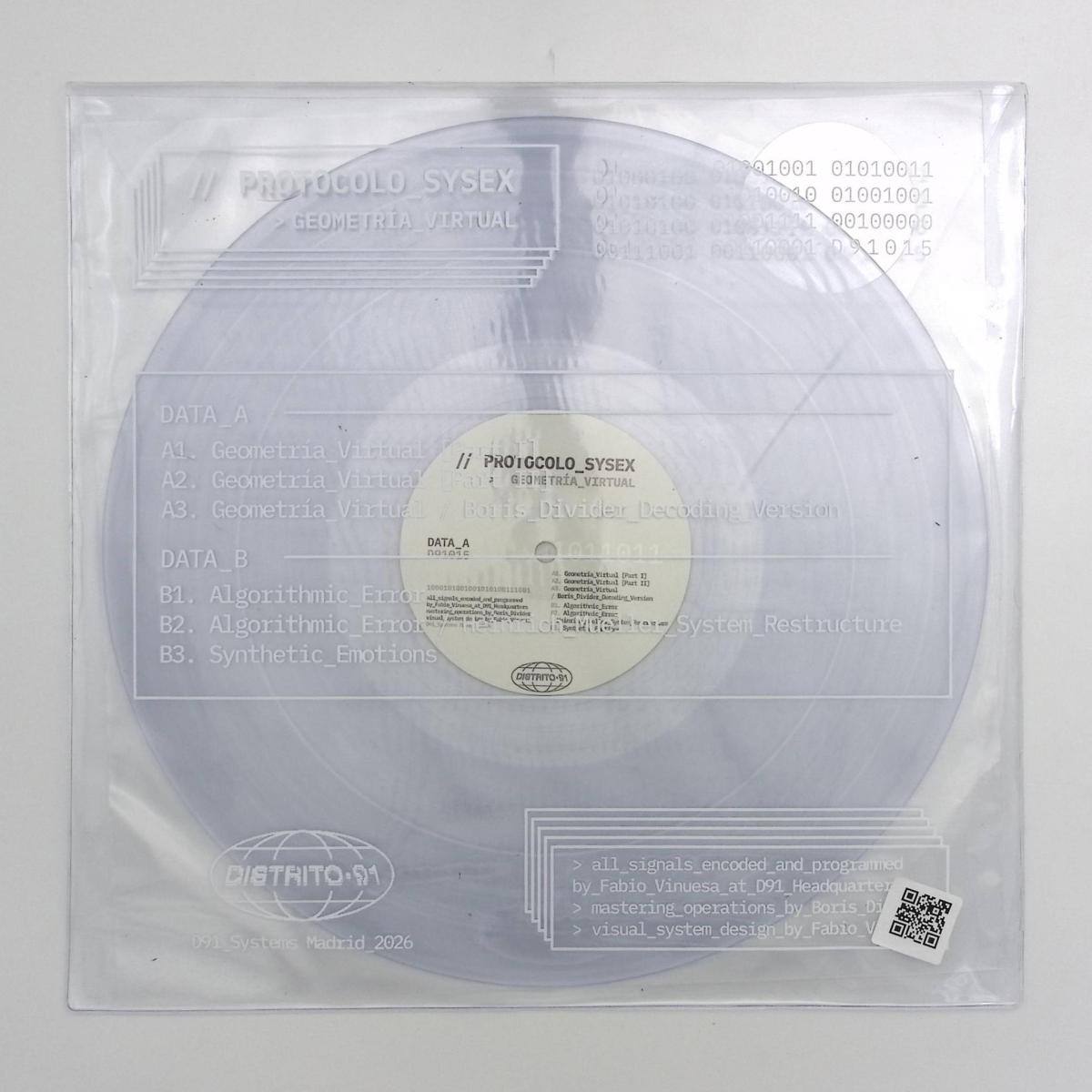GEOMETRÍA VIRTUAL documents a scenario in which mechanisms of control cease to function as external layers and instead become the very foundation of the system. The album does not propose a future dystopia, but rather a reality in which decision-making is automated and artificial intelligence is established as a structure of social control.Protocolo SysEx, a project by Fabio Vinuesa, is conceived as a narrative and sonic framework from which to examine the political and philosophical implications of a world governed by artificial intelligence. The release includes reinterpretations by Boris Divider and Heinrich Mueller and constitutes the first chapter of a trilogy focused on the progressive normalization of algorithmic control.