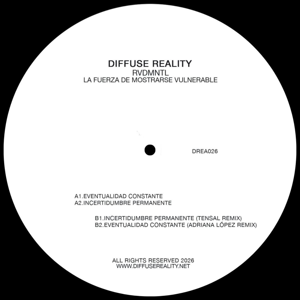 29Diffuse Reality presents RVDMNTL - La Fuerza De Mostrarse Vulnerable. A 12" vinyl and digital release built on solid, robust Techno. Four tracks on vinyl, complemented by three additional digital cuts. Powerful sounds, raw textures, and atmospheres that pull you deep into an inner ocean. The vinyl includes remixes by Adriana Lopez and Tensal, adding even more rigidity and intensity with their signature sound. Here, the sound reveals itself as aggressive and abrasive, a record that will go straight into your bag for those moments of pure tension and impact.