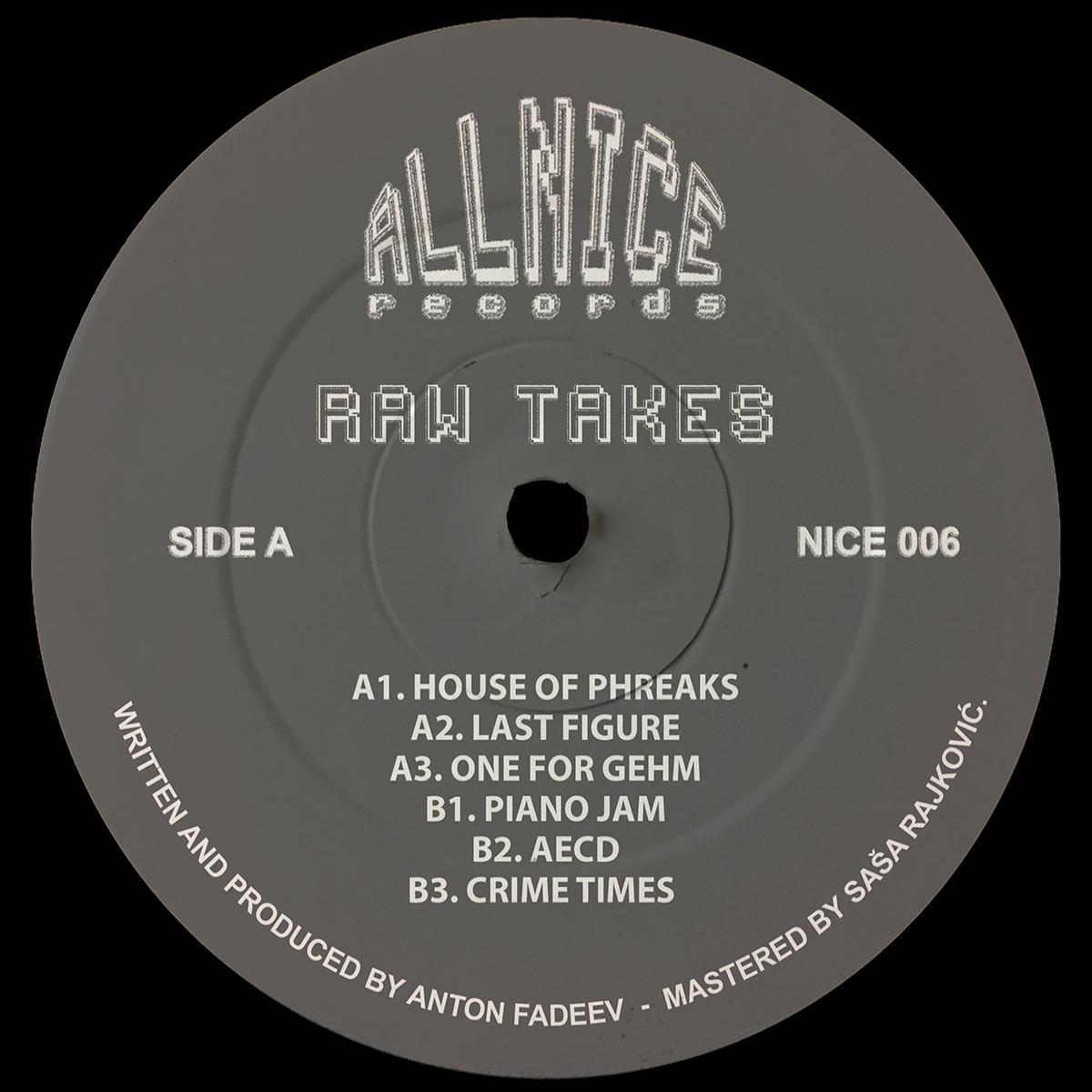 4All Nice Records returns with the 006 instalment, welcoming Raw Takes to the roster for a self-titled six-tracker that lives up to its name. No frills, no fuss, just pure, unfiltered club music pressed on wax Side A kicks off with House of Phreaks, a dense Chicago house sledgehammer built around a heavyweight bassline that sets the pace from the first bar, no introduction needed. Last Figure pulls the tension tighter before One For Gehm closes the first side as a heartfelt nod to Andreas Gehm - the legendary German acid pioneer whose influence continues to ripple through the underground. Flip it over and Piano Jam brings an unexpected melodic warmth to the centre of the record, while AECD wears its influences proudly, a 303-drenched acid workout rooted deep in the classic Chicago house tradition, the kind of track that feels like it could have come straight out of the Warehouse era. Crime Times seals the deal... gritty, atmospheric, and built for the late hours.