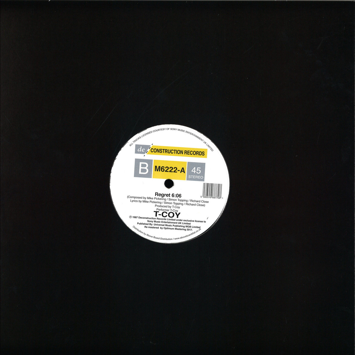 T-Coy's 'Cariño' - An all-time UK acid house classic from 1987. Fusing the industrial clicking and whirring of the UK's post-industrial landscape with the lush, melodic, balearic inspired piano lines of the white isle and sucking us all in in the process. A true masterpiece courtesy of Mancunians Mike Pickering, Simon Topping and the late Ritchie Close who's combined projects included Quando Quango, M-People, Annette, A Certain Ratio and more. It's truly hard to believe this record is 30 years old. It can easily stand shoulder to shoulder with anything being released today. The B-side 'Regret' is also an amazing, minimal slice of punk-funky 808 driven niceness. Super stripped back and with an innocent charm and poppy vibe it is the perfect foil to the latino house chaos of 'Cariño' on the other side. One could argue that the A-side will take you up, and the B-side will bring you down (In the best possible way!). This classic has been legally reissued by Above Board distribution in conjunction with the legal rights holders - Sony Music Entertainment. This high quality repress features original 1987 Deconstruction Records label artwork and has been remastered from Sony's original sources by Optimum Mastering, Bristol UK.