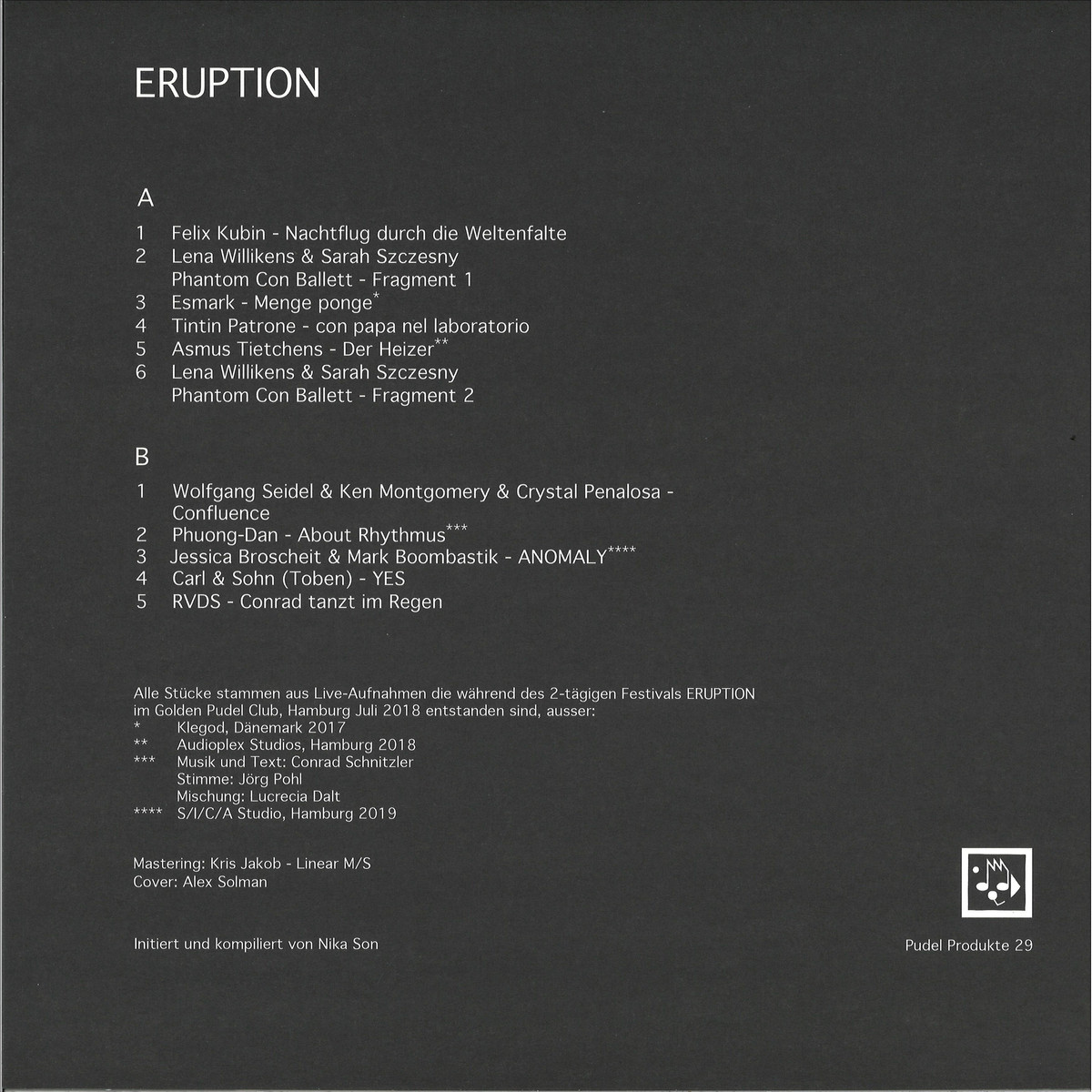 ERUPTION is an outburst of creaking energies, unconventional ideas, arhythmic thoughts, cacophonous images and musical phantasms. ERUPTION is also the name of the second album by Kluster, a band project of the musician and video artist Conrad Schnitzler, who died in 2011, together with his colleagues Dieter Moebius and Hans-Joachim Roedelius. ERUPTION was also the name of a two-day festival that took place in July 2018 at the Golden Pudel Club in Hamburg. For two days, artists and musicians from different generations and working in various fields met here, who were in one way or the other inspired by the comprehensive oeuvre Conrad Schnitzlers’, as well as by his free-spirited thoughts and actions. The result was a multi-faceted programme of concerts, performances, sound and video installations, which resulted in the release of these two special records on Pudel Produkte, the house-own label of the Golden Pudel Club. The single features a previously unreleased piece by Conrad Schnitzler & Ken Montgomery as well as a story told by Asmus Tietchens about his father and Schnitzler, who unwittingly crossed the Atlantic together on the steamboat Bornhofen in the late 1950s, one as an engineer, the other as a heater. The LP brings together the festival's invited artists, Schnitzler‘s contemporaries