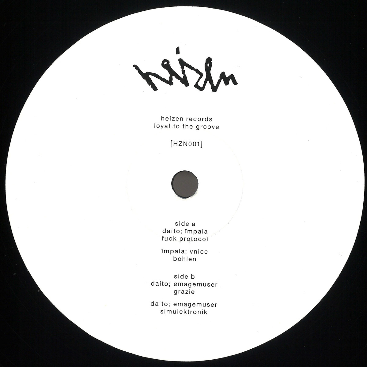 The debut EP of 'heizen records' takes a step aside from modern production techniques heading towards a late 90's/early 2000's sound. Without waiting for permission, Daito & impala kick off with 'Fuck Protocol', a warehouse tool containing two simple yet well placed synths followed by a pushy acid-lead giving the first track an incredibly energetic drive. impala's & vnice's 'Bohlen' is a ghetto-tech homage with a catchy vocal and a propulsive kick and bass combo which brings you straight to the party. On the B-side, Daito's & emagemuser's 'Grazie' comes in like a stomping closing banger quickly gathering a lot of momentum through its polyrhythmic structure and dreamy pad-synths, whereas the beat of 'Simulektronik' conveys a trippy yet shaky feeling through the swinging synergy of a clamouring synth-line and semiquaver hats followed by a suprising bass lead.