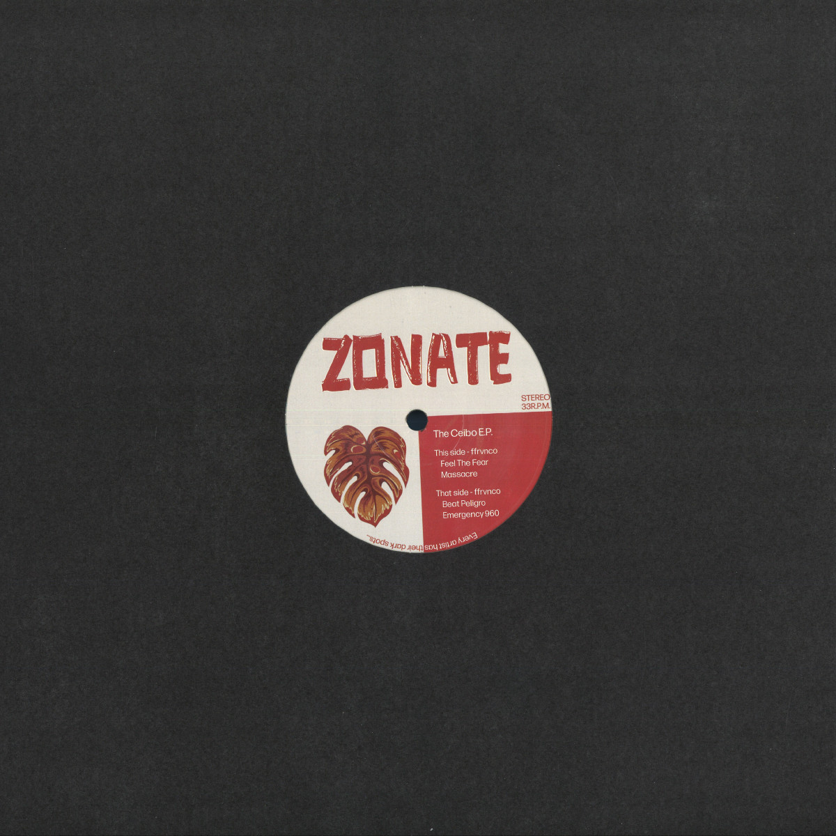 Zonate's third installment, "The Ceibo EP," showcases the full spectrum of Argentinian artist - ffrvnco. The A side kicks off with two peak-time tracks: "Feel The Fear," featuring a relentless driving bassline, and "Massacre," which takes a hypnotic, trancey turn. On the B side, ffrvnco switches gears to deliver synthier electro tracks reminiscent of the mid-2000s with a modern twist. "Beat Peligro" stands out with its vocoder vocals, before signing off the release with the emotion fuelled "Emergency 960".