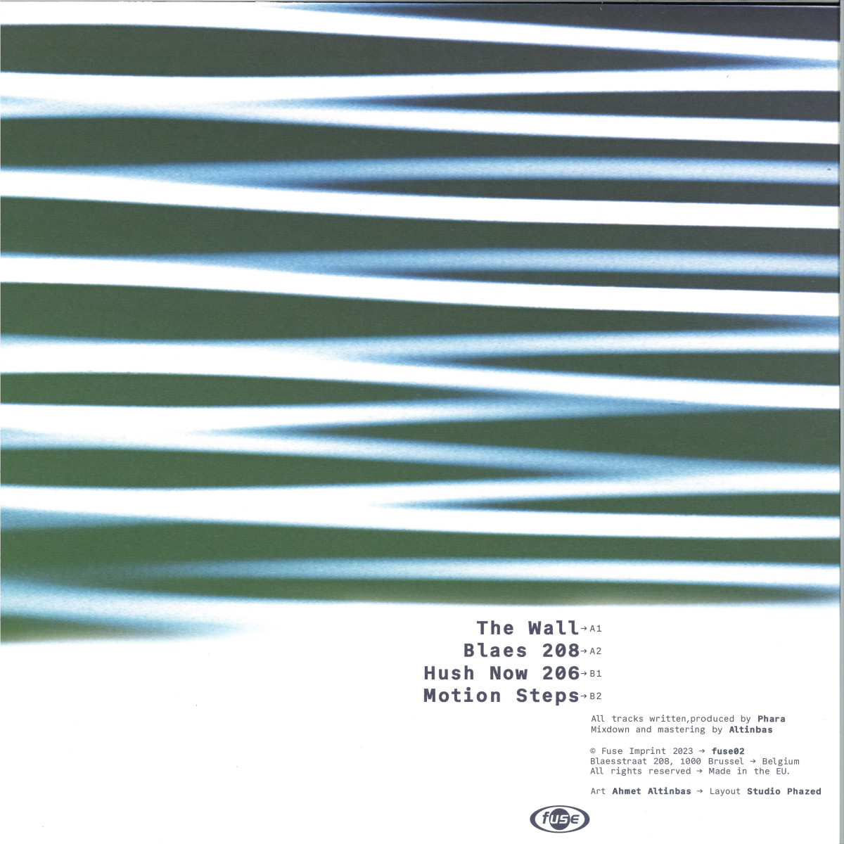 The EP's title track serves as a hypnotic introduction for the A1, imposing a bass-heavy rhythm and a persistently oscillating synthline. A dense production full of energy, 'The Wall' inspires intrigue throughout its duration, revealing its true intentions through a capable sound system. Sharing the first side of the press is 'Blaes 208', a name that Fuse club goers will likely recognise, that guides the listener from effect into embrace. With lush keys echoing past a comforting drum sequence fit for a close-eyed dancefloor experience, Phara's impactful tendencies meet his affinity for the melodic through a blissful six minutes of crowd to selector connection. Switching sides, a return to a cold cold aesthetic is quickly apparent through 'Hush Now 206'. A pummeling, saturated bass competes with a kick of equal effect, rolling through a storm of metallic stabs. Mastering the message of urgency, Phara presents a lightshow of resonating percussive work, defining his space just to cut right through it. To close out with a lasting impression, the producer mutes the acoustics of his work through razor-sharp sound design dotting along playful snares, a duality reminiscent of the dynamism of Detroit electro. 'Motion Steps', referring to the stairs that ascend from Fuse's main room to its more left-field counterpart, captures the atmosphere of the almost shimmering music that can be expected to be played there; a place where Phara and many others have been known to explore the extremities of their music. He swiftly throws in melodic elements to recontextualize an otherwise pressing composition, and after three chapters of considerable weight, he concludes his record with infectious groove that flaunts technical ability.